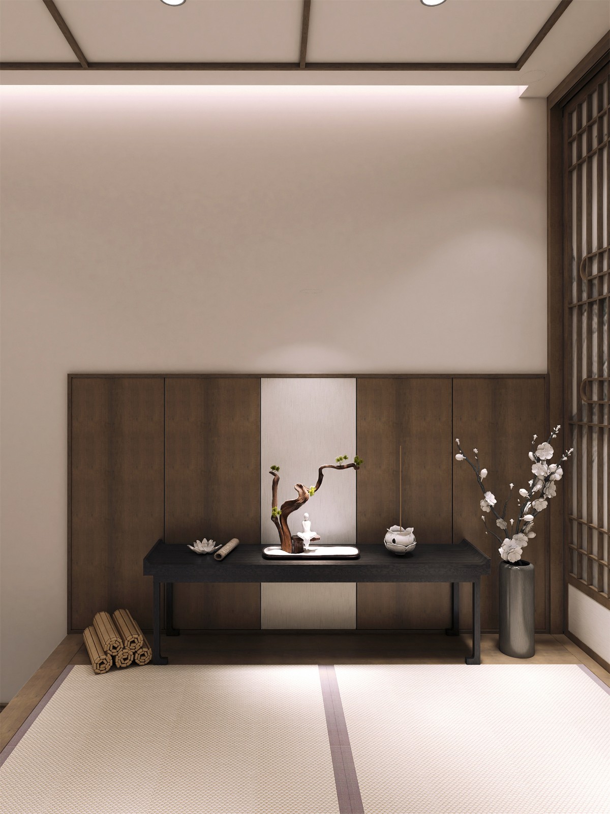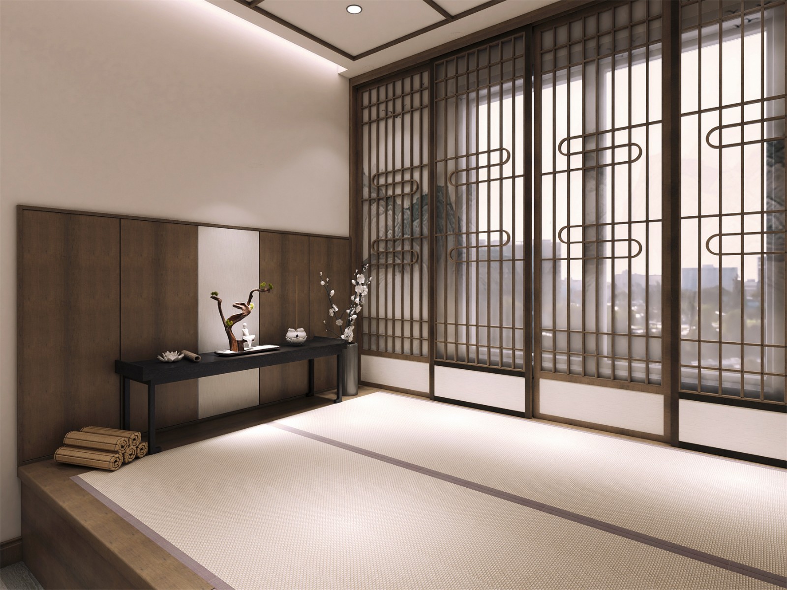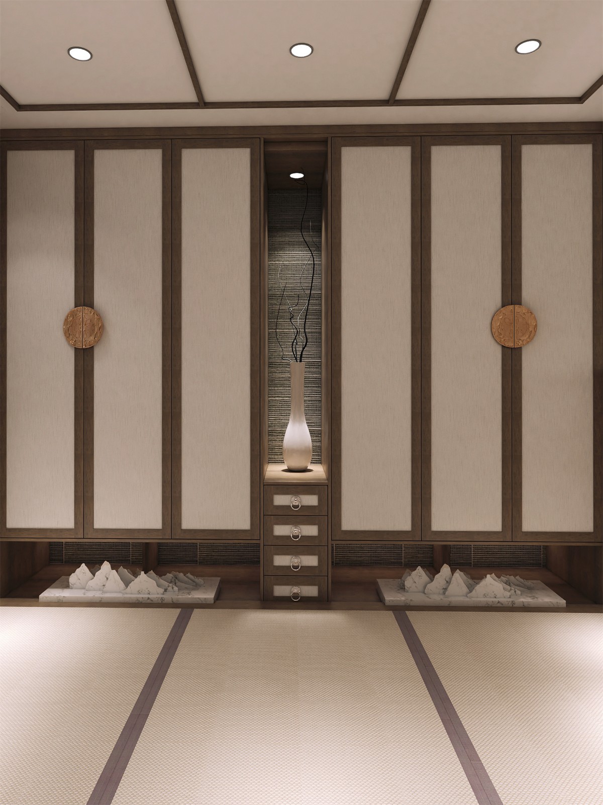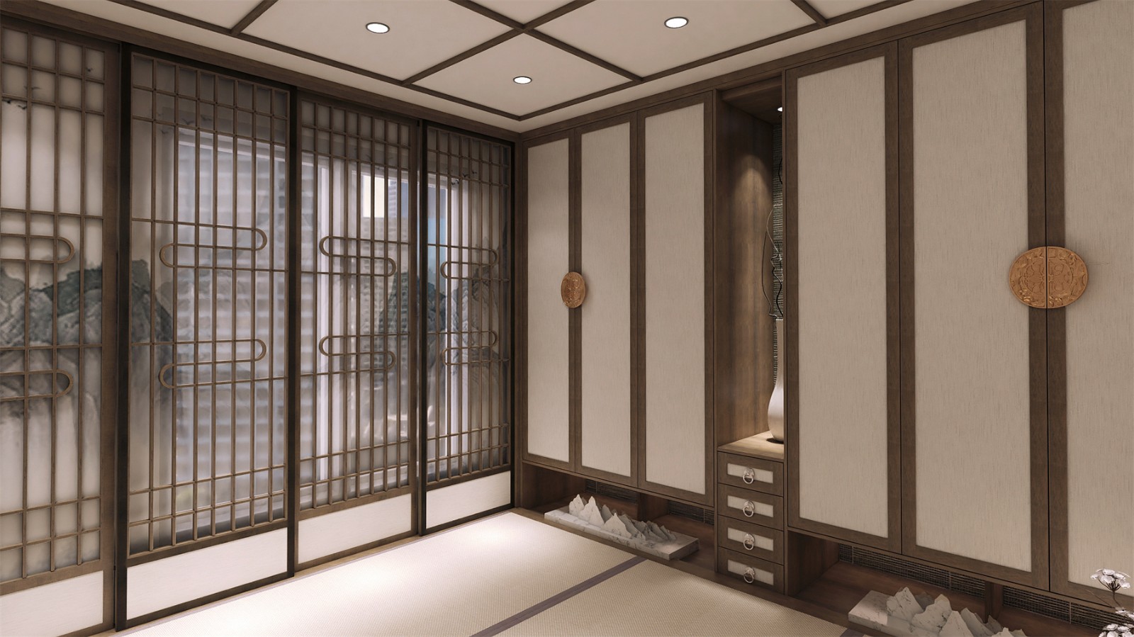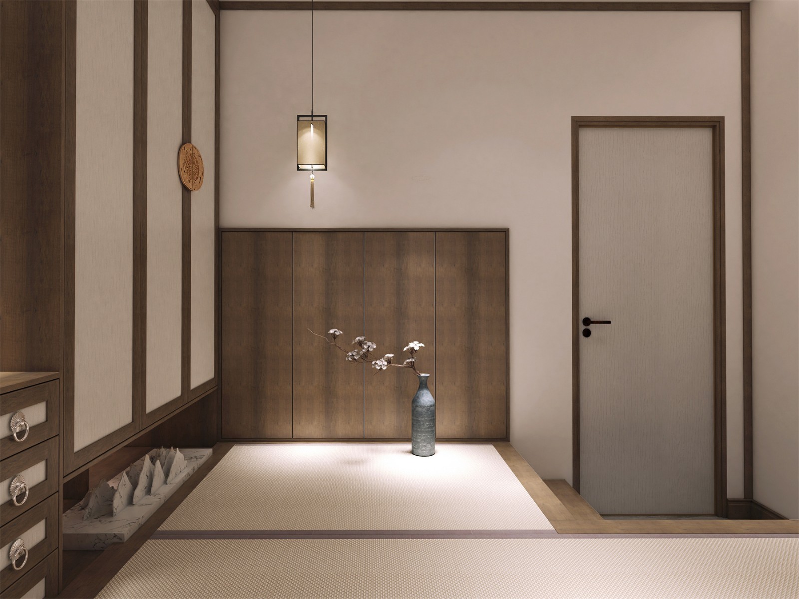 该案例整体采用非洲胡桃木设计,米白色榻榻米垫子搭配同色系的福斯玛柜门,深色的胡桃木点缀其中,整体色调低调沉稳,古朴端庄,让空间更显大气整洁。